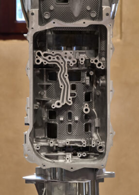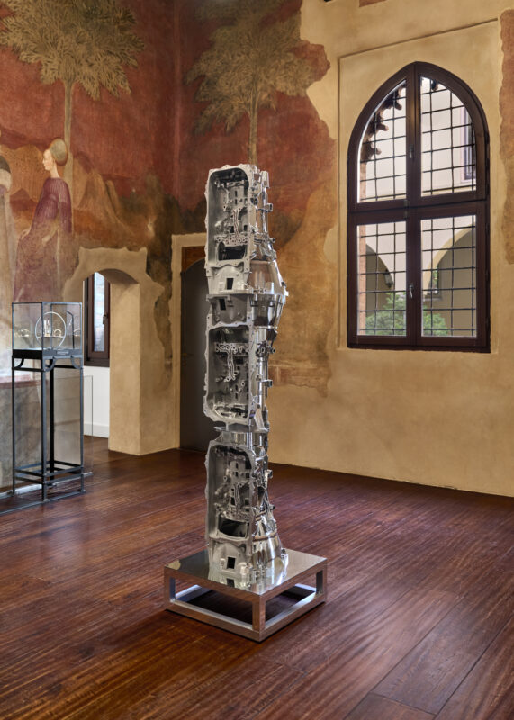 The exhibition’s centerpiece is a monumental sculpture that transforms truck gearbox casings into a futuristic architectural form. This reinvention of industrial architecture is intrinsically linked to the artist’s practice of exploring industrial materiality and its contemporary echoes. Mary reworks elements of modernity—highways, neon signs, and heavy machinery—into a sculptural language that merges a fascination with the machine with a critical eye on its legacy and future.