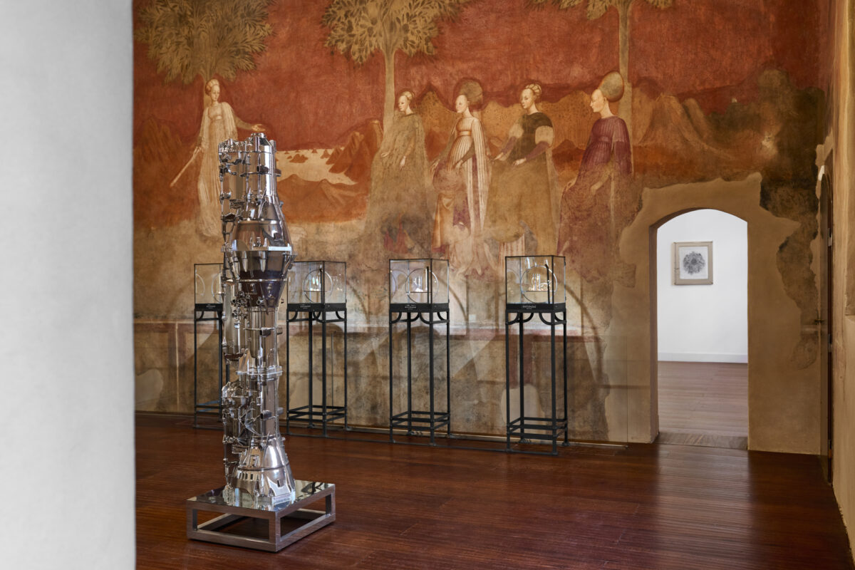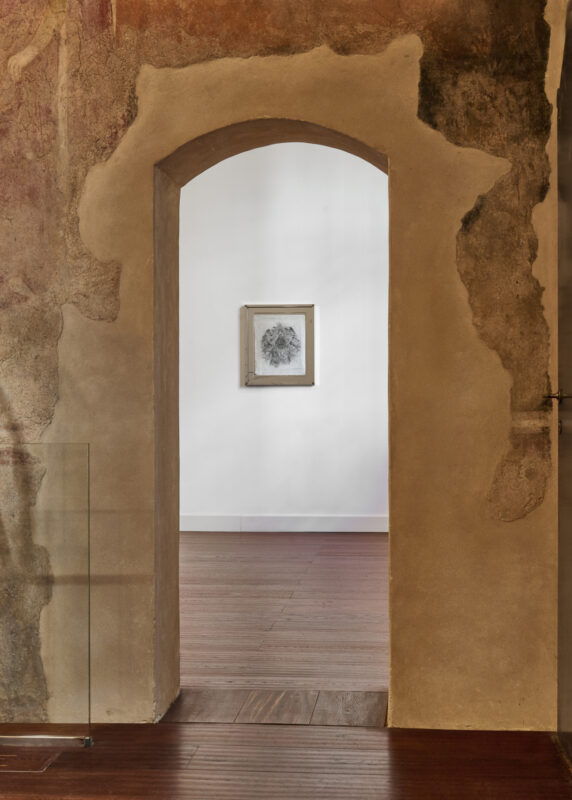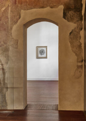 The exhibition concludes with a return to the figurative image, creating continuity between the frescoes room and the white room, the drawing titled “Sorrows of Dark Enlightenment,” which serves as both a tribute to Milan and a reflection on the inner world that divides each of us as citizens of the modern world.