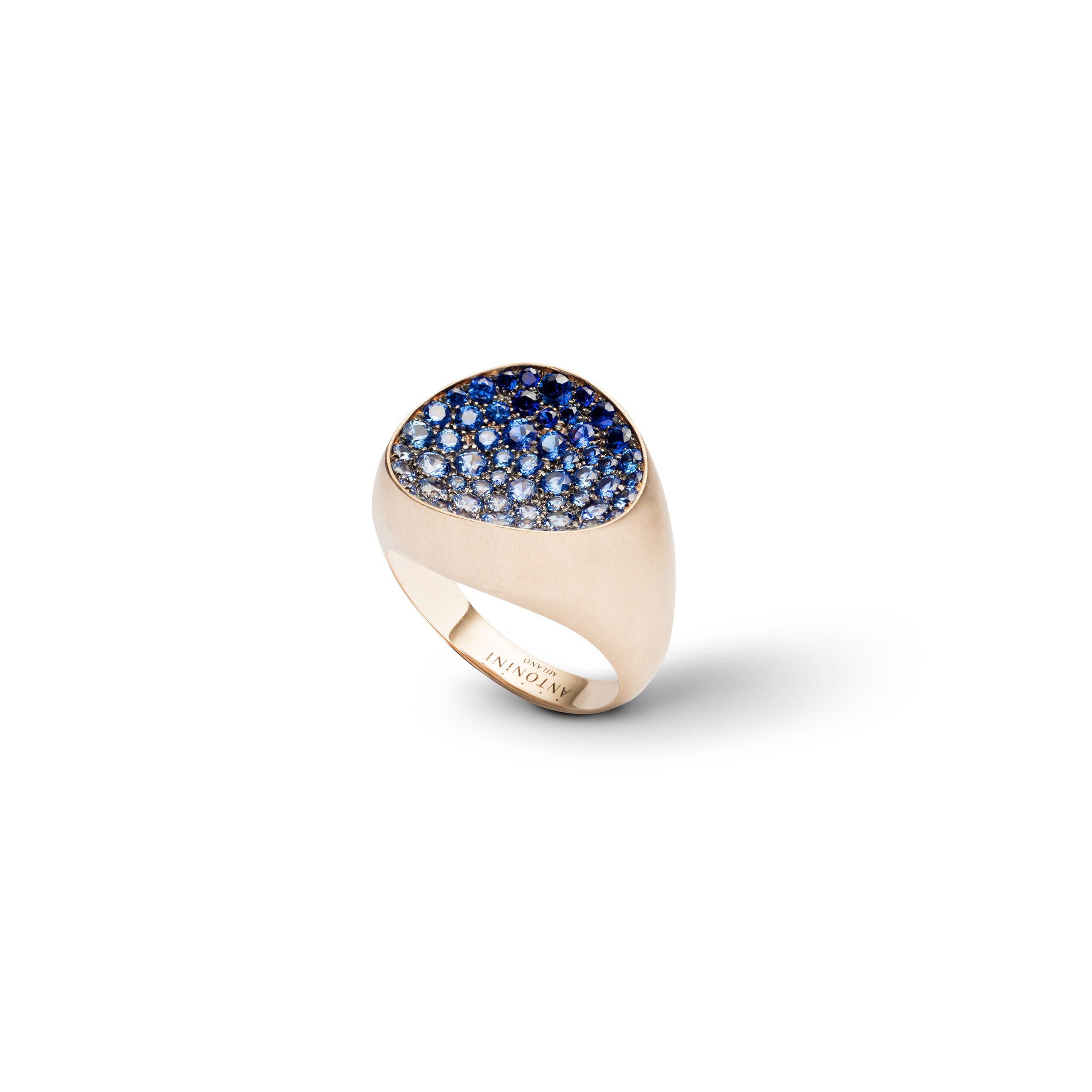 Small ring in white natural matt gold and blue sapphires shadow pavé, 18kt